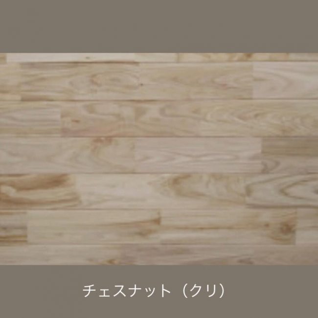 耐久性、耐水性に優れているクリは、古くから家屋の土台の材料として用いられてきました。そして、膨張収縮率も低いためフローリング材にも適しています。歴史ある優良材です。オークがお好きな方は、クリも気になられる一種かと思います。栗はオークよりも木目がはっきりしているのが特徴です。お値段は、オークの方が高価になります。